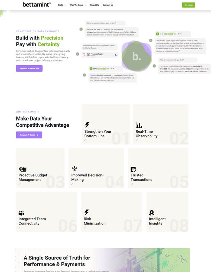 Bettamint is a digital construction workforce and project data platform that brings real-time visibility, performance tracking, and automated payment workflows to builders, contractors, and financiers. I contributed to developing features around data capture, verification, and financial integration that help construction teams manage labour, costs, and payouts with transparency and accuracy.